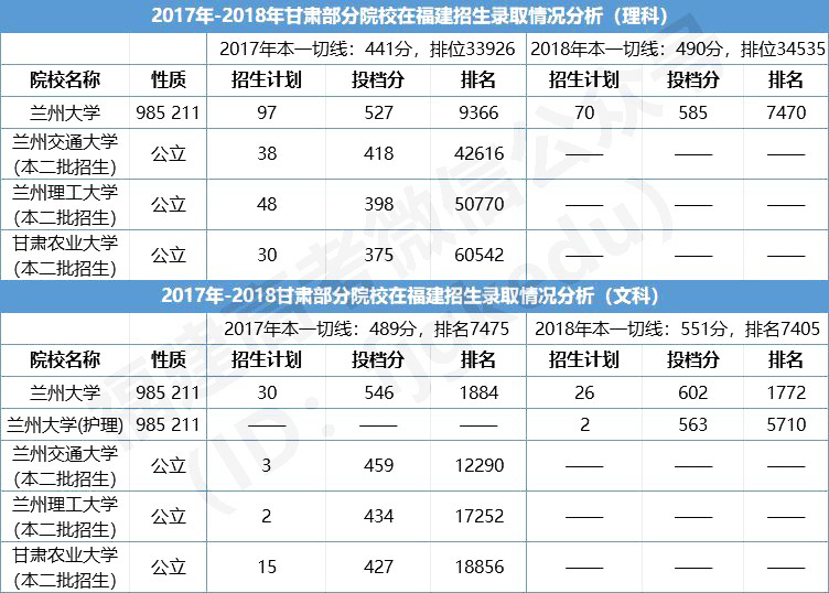 甘肅的情況與青海近似,也因地域問題非填報(bào)熱門,但是從近兩年的錄取情況來看,蘭州大學(xué)的分?jǐn)?shù)仍是理科超線90分左右,文科超線分50分左右。其他院校均面向福建省為本二批招生,但院校優(yōu)勢不弱,值得考慮填報(bào)。