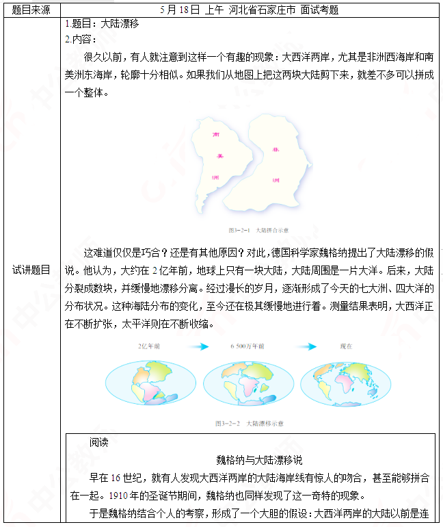 2019上教師資格面試真題解析:初中地理《大陸漂移》