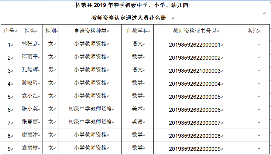 根據(jù)省、市關(guān)于2019年中小學(xué)教師資格認(rèn)定工作的部署和《關(guān)于做好2019年中小學(xué)教師資格認(rèn)定工作的通知》(柘教〔2019〕56號(hào)),我縣2019年春季初級(jí)中學(xué)、小學(xué)、幼兒園教師資格認(rèn)定工作經(jīng)網(wǎng)上申請(qǐng)、現(xiàn)場確認(rèn)受理、健康體檢及審核認(rèn)定等程序,55位申請(qǐng)人符合認(rèn)定條件,給予認(rèn)定初級(jí)中學(xué)、小學(xué)、幼兒園教師資格,并頒發(fā)相應(yīng)教師資格證書。