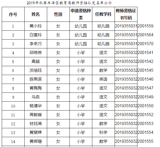 2019年秋季豐澤區(qū)教育局教師資格認(rèn)定名單已經(jīng)公示,具體名單見附件: