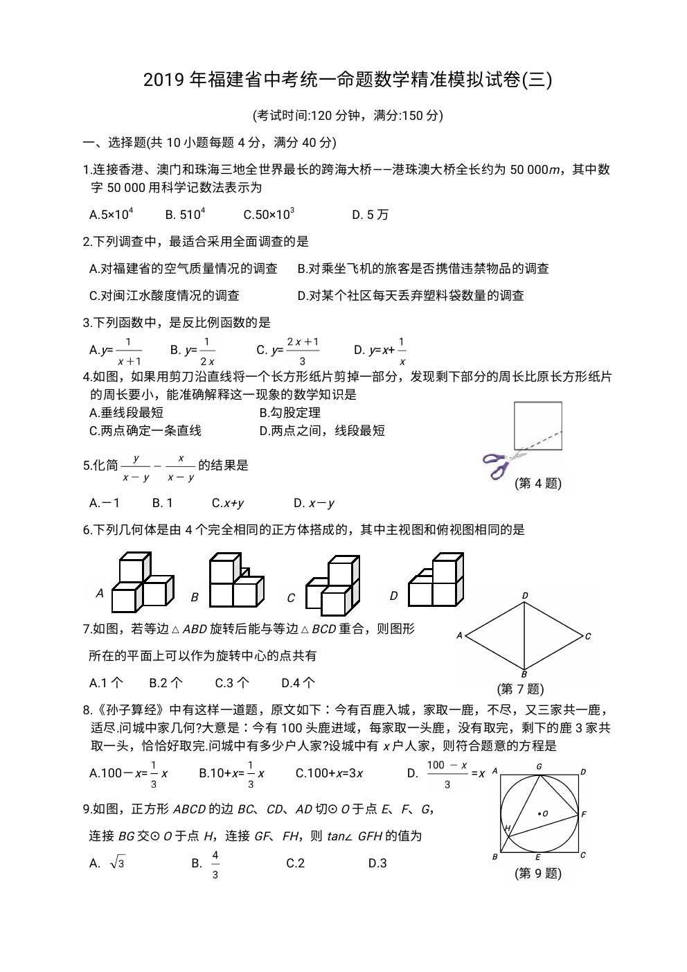 【摘要】福建省2019年中考統(tǒng)一命題精準數(shù)學(xué)模擬測試題及答案(3)!更多中考信息可關(guān)注閩州教育中考資訊專欄。
