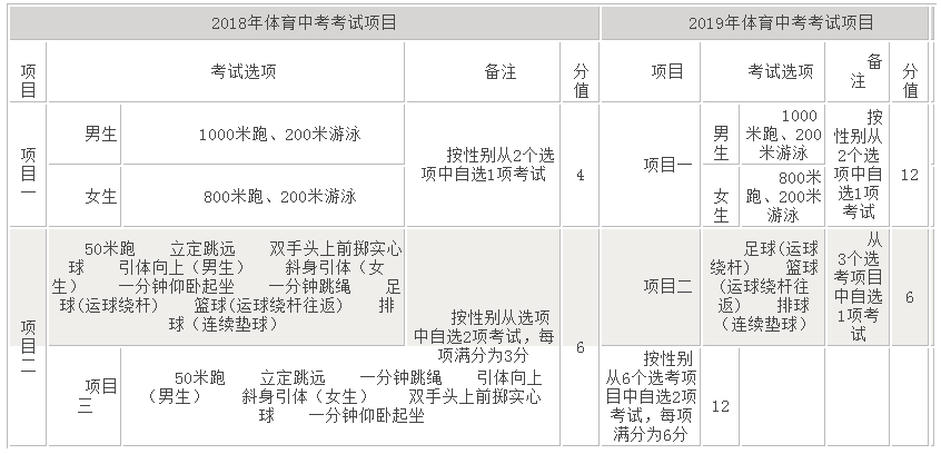 一.福州中考考試項(xiàng)目設(shè)置和分值調(diào)整 2019年福州市初中畢業(yè)考試分值為30分,根據(jù)省教育廳文件精神,將體育中考考試項(xiàng)目按照耐力、運(yùn)動(dòng)技能和身體素質(zhì)分為三類(lèi),福州中考體育考試項(xiàng)目由三項(xiàng)調(diào)整為四項(xiàng),即必考一項(xiàng),選考三項(xiàng)。 福州中考體育第一類(lèi)為必考的耐力選項(xiàng),考生將從長(zhǎng)跑和游泳中選擇一個(gè)項(xiàng)目進(jìn)行考試;第二類(lèi)為運(yùn)動(dòng)技能選項(xiàng),考生將從籃球運(yùn)球、足球運(yùn)球和排球墊球中選擇一個(gè)項(xiàng)目進(jìn)行考試;第三類(lèi)為身體素質(zhì)選項(xiàng),考生從六個(gè)選項(xiàng)中選擇兩個(gè)項(xiàng)目進(jìn)行考試。 福州中考體育分值分別為必考項(xiàng)滿分12分,選考項(xiàng)每項(xiàng)滿分6分,合計(jì)為30分。同時(shí),為減少考生的負(fù)擔(dān),2019年,將游泳項(xiàng)目考點(diǎn)設(shè)在省福建省奧林匹克體育中心游泳館。 二.2019福州中考體育考試項(xiàng)目對(duì)照表 2019年體育中考的評(píng)分標(biāo)準(zhǔn)根據(jù)2018年考試大數(shù)據(jù)分析情況進(jìn)行微調(diào),其中,根據(jù)中招細(xì)則計(jì)分方法,考試成績(jī)得分相加后保留小數(shù)點(diǎn)后一位數(shù)為最后得分,小數(shù)點(diǎn)后一位數(shù)計(jì)算方法為:小數(shù)點(diǎn)后的數(shù)字小于0.25分(不含0.25分)不予計(jì)算;大于或者等于0.25分,小于0.75分,計(jì)為0.5分;大于或者等于0.75分,計(jì)為1分