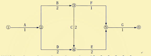(2)關(guān)鍵線路:工作A→工作B→工作C→工作E→工作G(或①→②→③→④→⑤→⑥)。