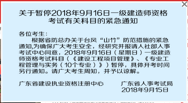 根據(jù)省防總辦關(guān)于臺(tái)風(fēng)“山竹”防范措施的緊張通知,為確保廣大考生安全,經(jīng)研究并報(bào)請(qǐng)人社部人事考試中心同意,2018年9月16日(星期日)一級(jí)建造師資格考試科目(《建設(shè)工程項(xiàng)目管理》、《專業(yè)工程管理與實(shí)務(wù)(10個(gè)專業(yè))》)暫停,具體開考時(shí)間另行通知。請(qǐng)廣大考生周知,并予以諒解。