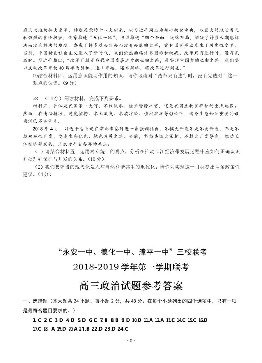 【摘要】2019“永安一中、德化一中、漳平一中”高三12月三校聯(lián)考政治試題及參考答案!更多高考信息可關(guān)注閩州教育高考資訊專欄。