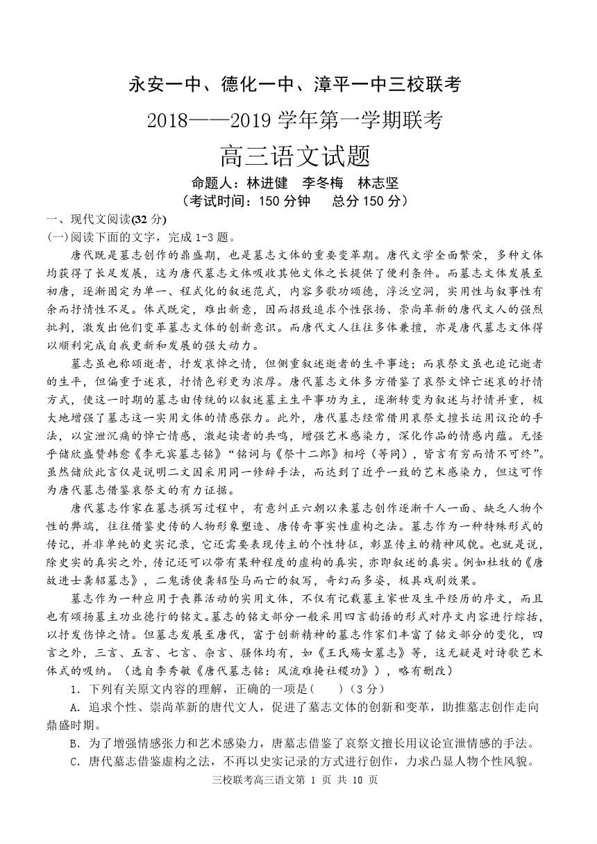【摘要】2019“永安一中、德化一中、漳平一中”高三12月三校聯(lián)考語文試題及參考答案,考生們可以針對題目來更好的復(fù)習(xí)哦,更多高考信息可關(guān)注閩州教育高考資訊專欄。