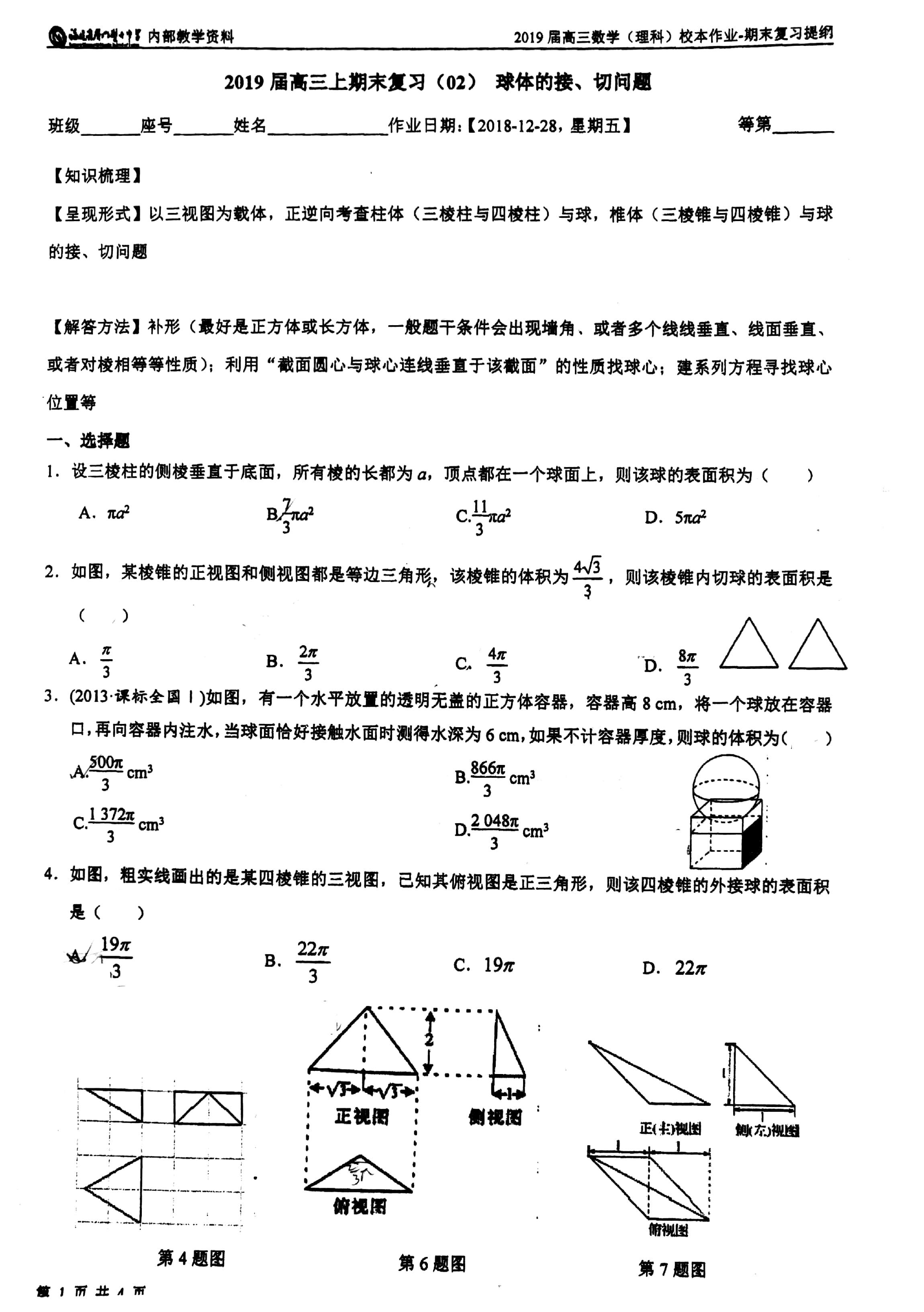 【摘要】福建廈門(mén)雙十中學(xué)2019屆高三上期末復(fù)習(xí)理科數(shù)學(xué)-球體的接切問(wèn)題!更多高考信息可關(guān)注閩州教育高考資訊專(zhuān)欄。