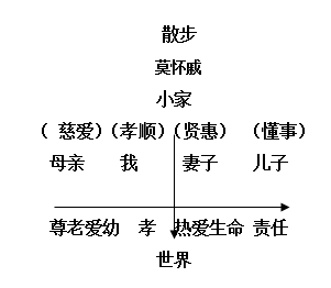 小結(jié):《散步》所表現(xiàn)的家庭情感都是建立在對生命深刻認(rèn)識的基礎(chǔ)上的。作為生命鏈條中最關(guān)鍵環(huán)節(jié)的中年人, 對上孝順老人、對下呵護(hù)孩子,不僅僅是因為家庭情感的緣故,更是一種對生命的把握與珍惜,是一種對生命的神圣的責(zé)任感所使然。所以我們說“ 情感” 主題論只是一種淺層的認(rèn)識。我們還可以理解到對生命的珍重和責(zé)任感,理解到小家和諧和世界和諧。