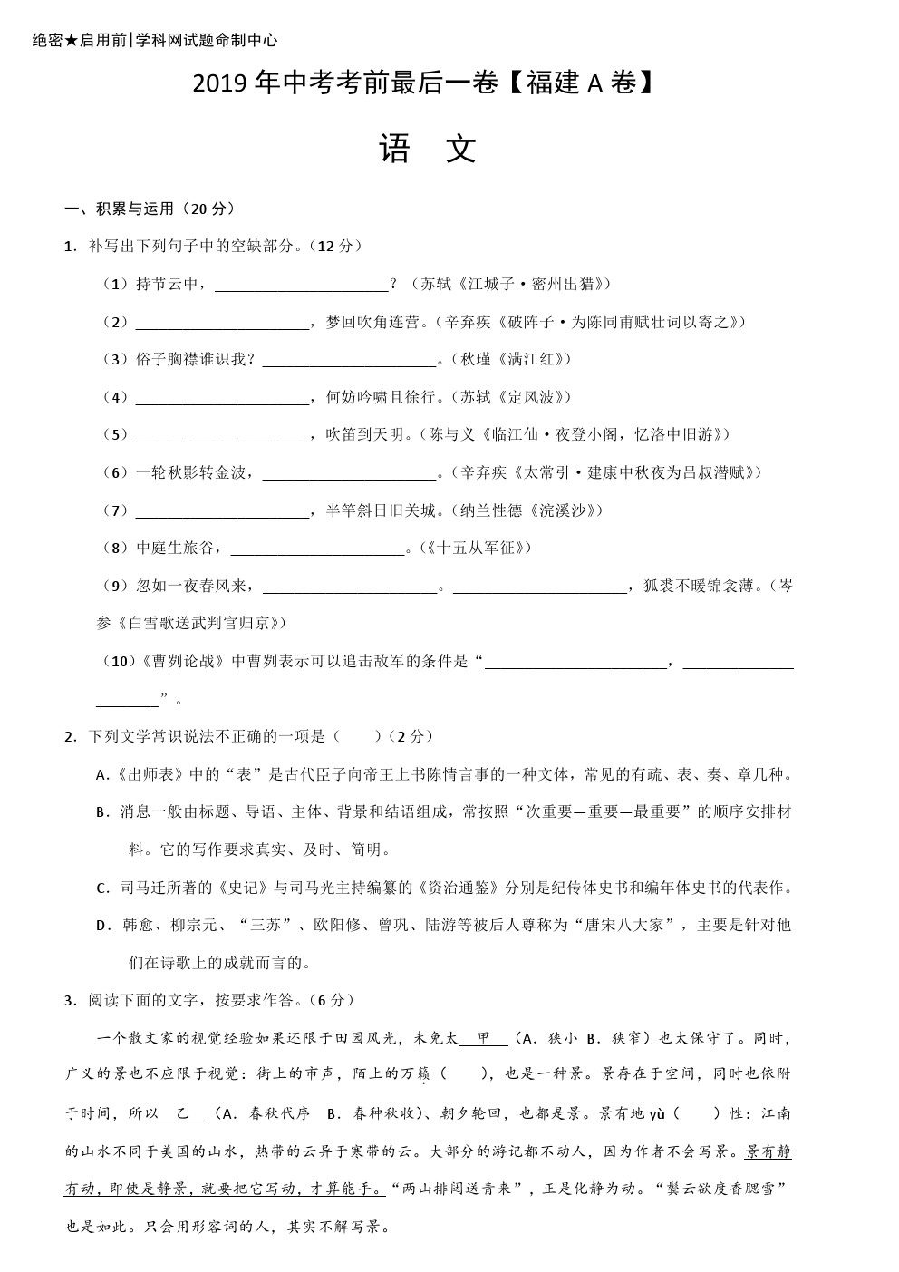 【摘要】【福建A卷】2019年初三中考考前最后一卷:語 文!更多中考信息可關注閩州教育中考資訊專欄。