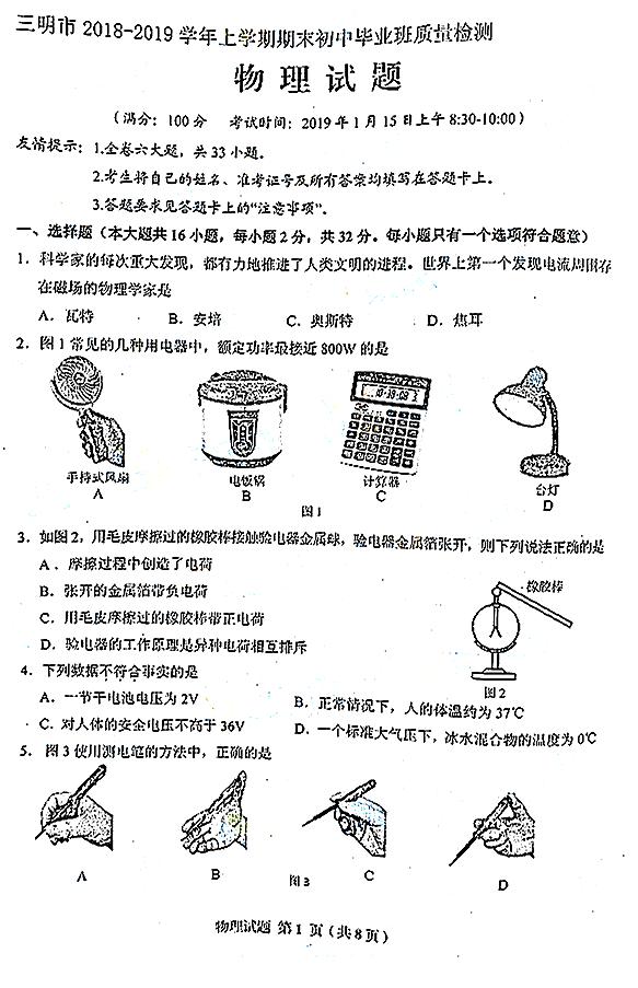 【摘要】福建省三明市2018-2019學(xué)年九年級(jí)上學(xué)期期末質(zhì)量檢測(cè)物理試題!更多中考信息可關(guān)注閩州教育中考資訊專欄。