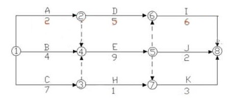 【解析】關(guān)鍵線路:①→③→④→⑤→⑥→⑧,計(jì)算工期7+9+6=22天。